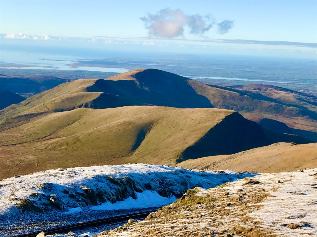 The Llanberis Path is the dullest and least exciting route up this popular mountain, but we could walk right from the camp site, and on a frosty Friday it wasn’t busy. The views were stunning, and we even got to see one of the mountain railway trains as the engineers worked to maintain the track.