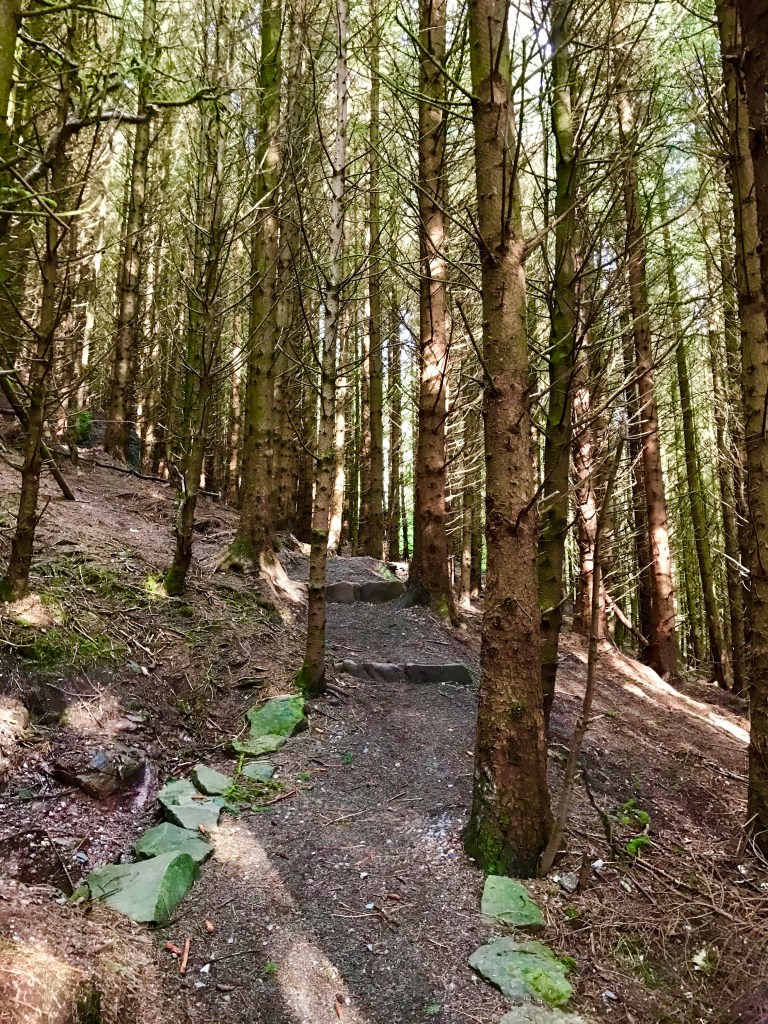 Beautiful track up through the forest with the sun shining through the trees. Dozens of trunks scattered like matchsticks felled by recent storms. The ground coated with fresh green twigs snapped from the trees.