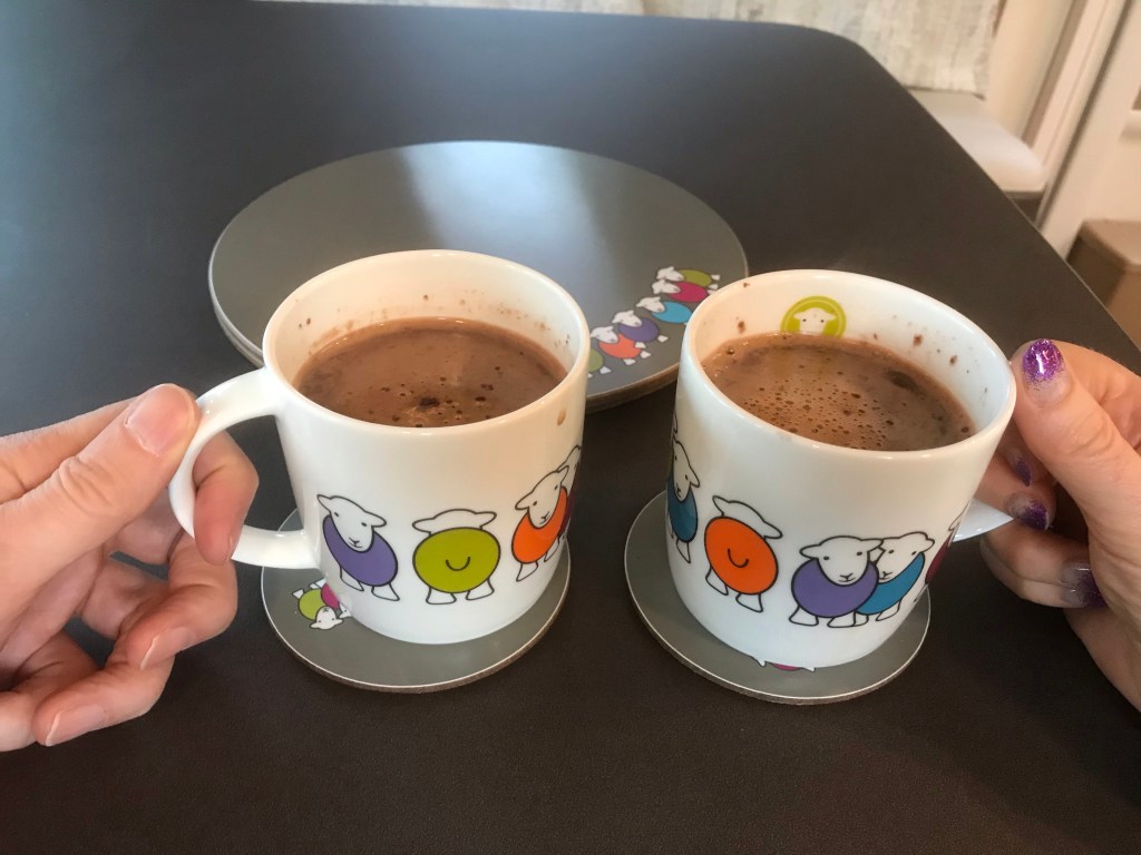 Hot chocolate back in Herdy. Back before the rain started, snuggled up with a hot drink.