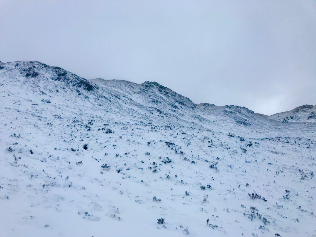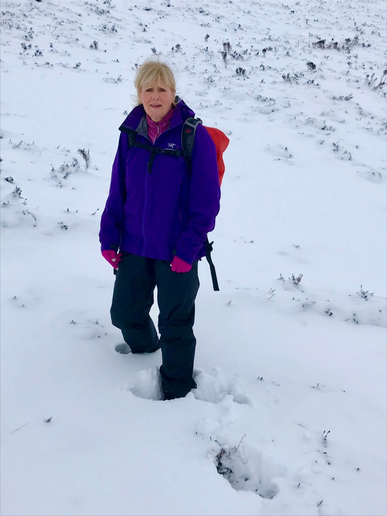 Reaching the plateau below the summit the snow was knee deep, and hidden beneath were streams and bogs. The path lost beneath deep drifts. We decided not to follow the trail of footprints heading straight for the summit, and as the cloud and rain closed in turned around. It was disappointing not to reach the top. But we had a good romp in deep snow and got down for lunch in the dry.